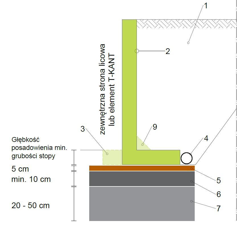 - Po montażu elementy zasypywać przynajmniej do wysokości stopy, aby nie było widoczne zwężenie odwadniające. Nie jest to wymagane, ale zalecane ze względów estetycznych (więcej na stronie 2 - schemat widoku zewnętrznej strony licowej lub T-Kant / bok 4 widok obszaru stopy).